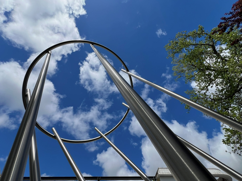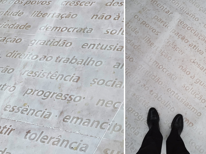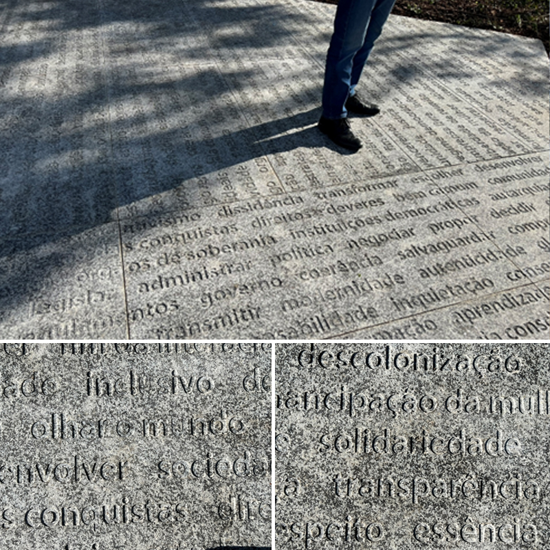 Liberdade , 2024 | Aço inoxidável e Granito | Escultura 5,50 x 2,90 x 5,76 m, pavimento com palavras gravadas: 8 x 8 m