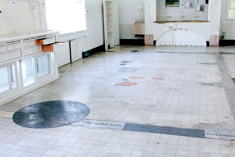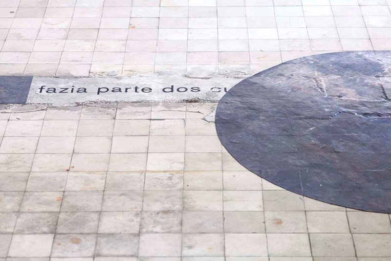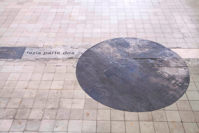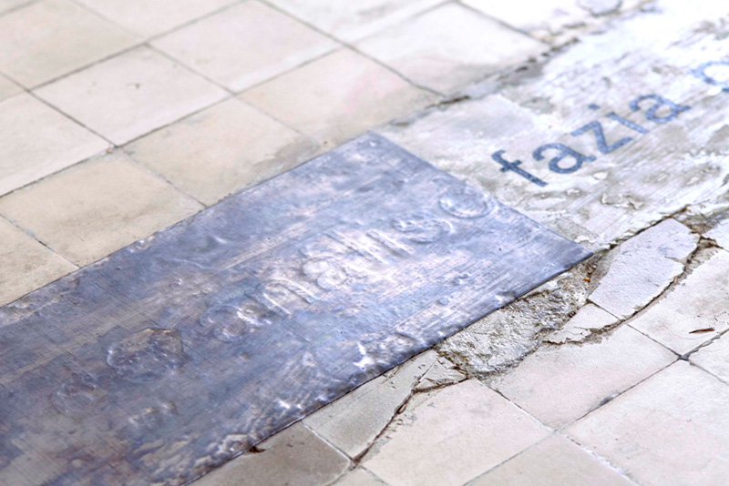 Polaridades Solúveis | Cristina Ataide | chumbo e palavras existentes no chão da sala | 2016